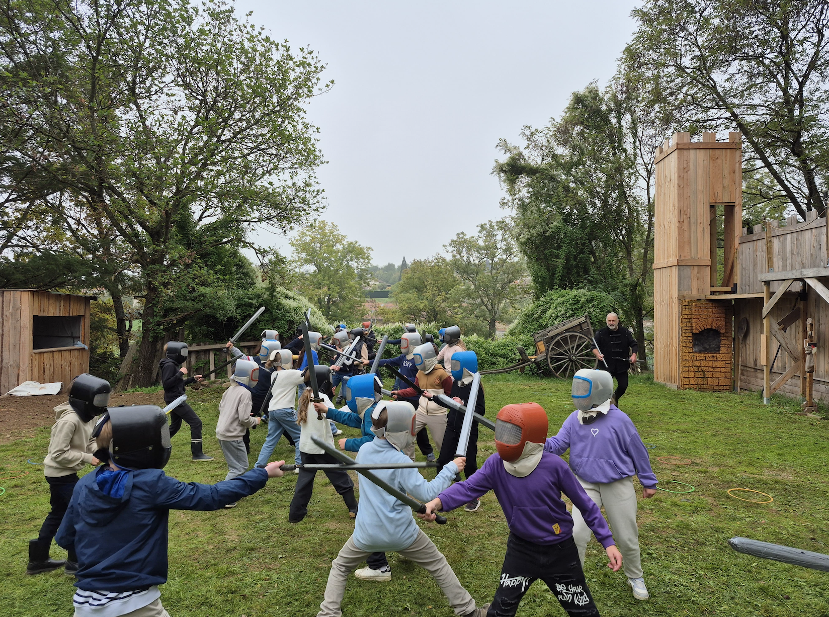 Nos élèves de sixième ont voyagé… dans le temps ! Lors de cette journée d’intégration sur le site de Kot de Maye, ils ont participé à plusieurs ateliers : - Calligraphie médiévale - Tir à l’arc - Maniement des épées...