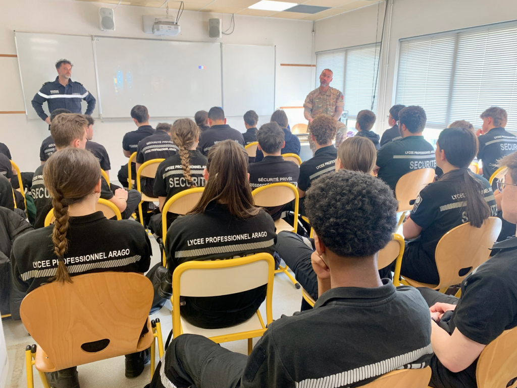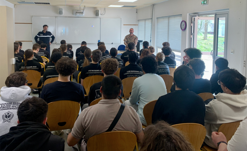 Ce 3 avril, le lycée Arago a accueilli l’Adjudant-chef Wilfried, conseiller en recrutement au CIRFA (Centre d’information et de recrutement des forces armées) de Roanne, le Maître principal Adrien de la Marine nationale (antenne de Roanne), ainsi que leurs collègues de la Police nationale de Roanne.