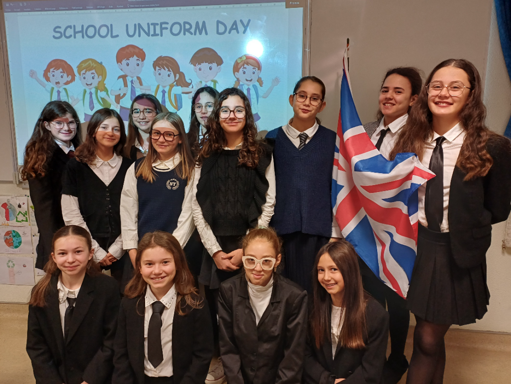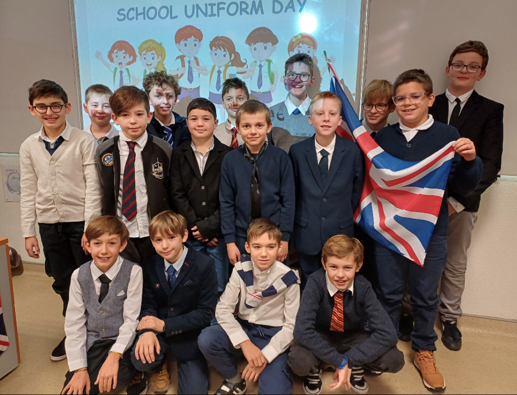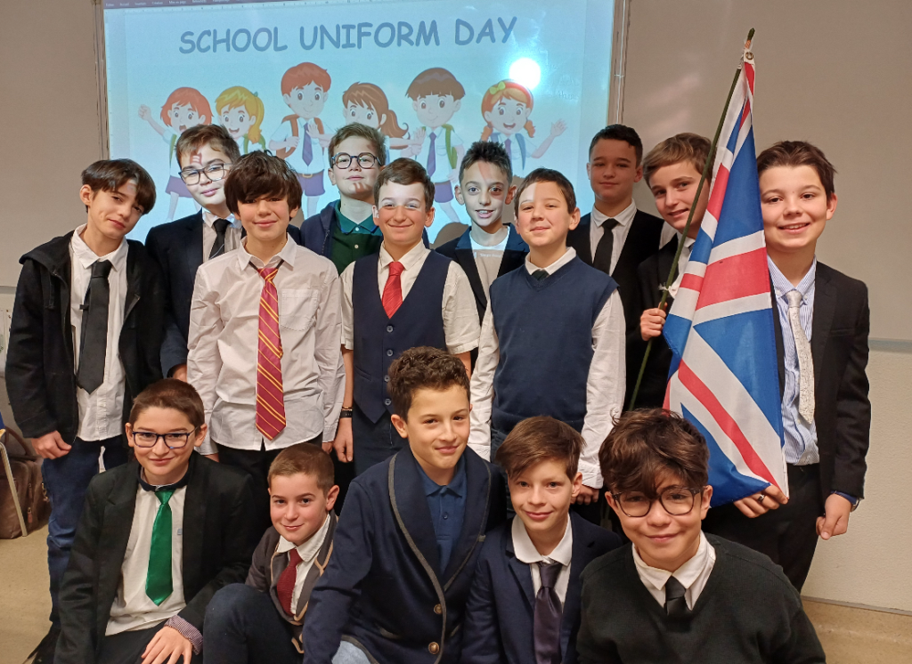 Mais ne vous y trompez pas ! Pas de celles que l’on instaure parce que c’est “vendeur” mais parce que c’est un immense bonheur renouvelé chaque année au mois de novembre, pour les 3 professeures d’anglais du collège, de voir leurs élèves de 6° relever avec un mélange d’effervescence et d’application un défi tout aussi culturel que pédagogique : venir habillés à la manière des élèves britanniques avec une tenue vestimentaire se rapprochant le plus possible de leur uniforme scolaire. Cette année encore, défi brillamment relevé ! Les photos en attestent, ainsi que les réactions enthousiastes des très nombreux visiteurs aux Portes Ouvertes du collège organisées le soir même. Les élèves les ont accueillis dans une belle convivialité et ont su les guider avec une assurance légèrement teintée de fierté. Les questions ont été nombreuses mais chaque guide, épaulé par ses professeurs a su y répondre avec sincérité et de manière très spontanée.